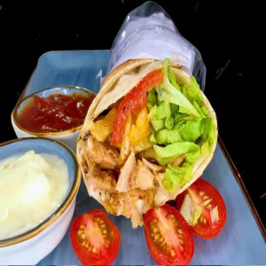 Pão sírio, molho de alho, carne, frango, tomate, cebola roxa, alface e batata frita.