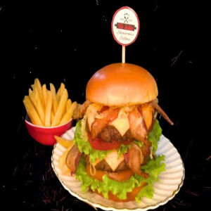 Pão brioche, 2 hambúrgueres bovinos 150g, 2x queijo cheddar, 2x bacon fatiado, tomate, alface e molho especial.