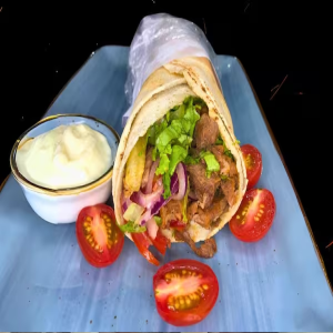Pão sírio, molho de alho, carne, tomate, cebola roxa, alface e batata frita.